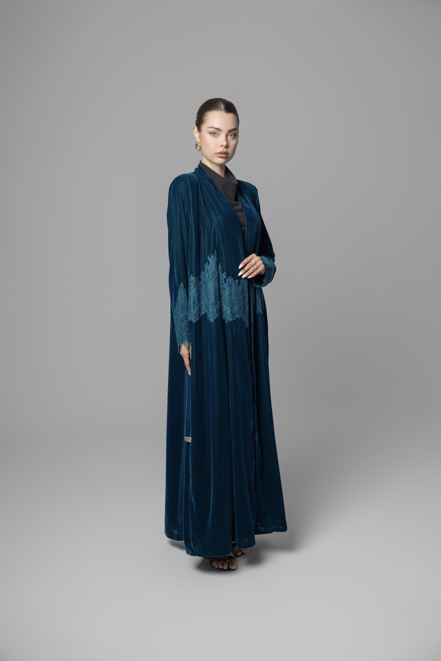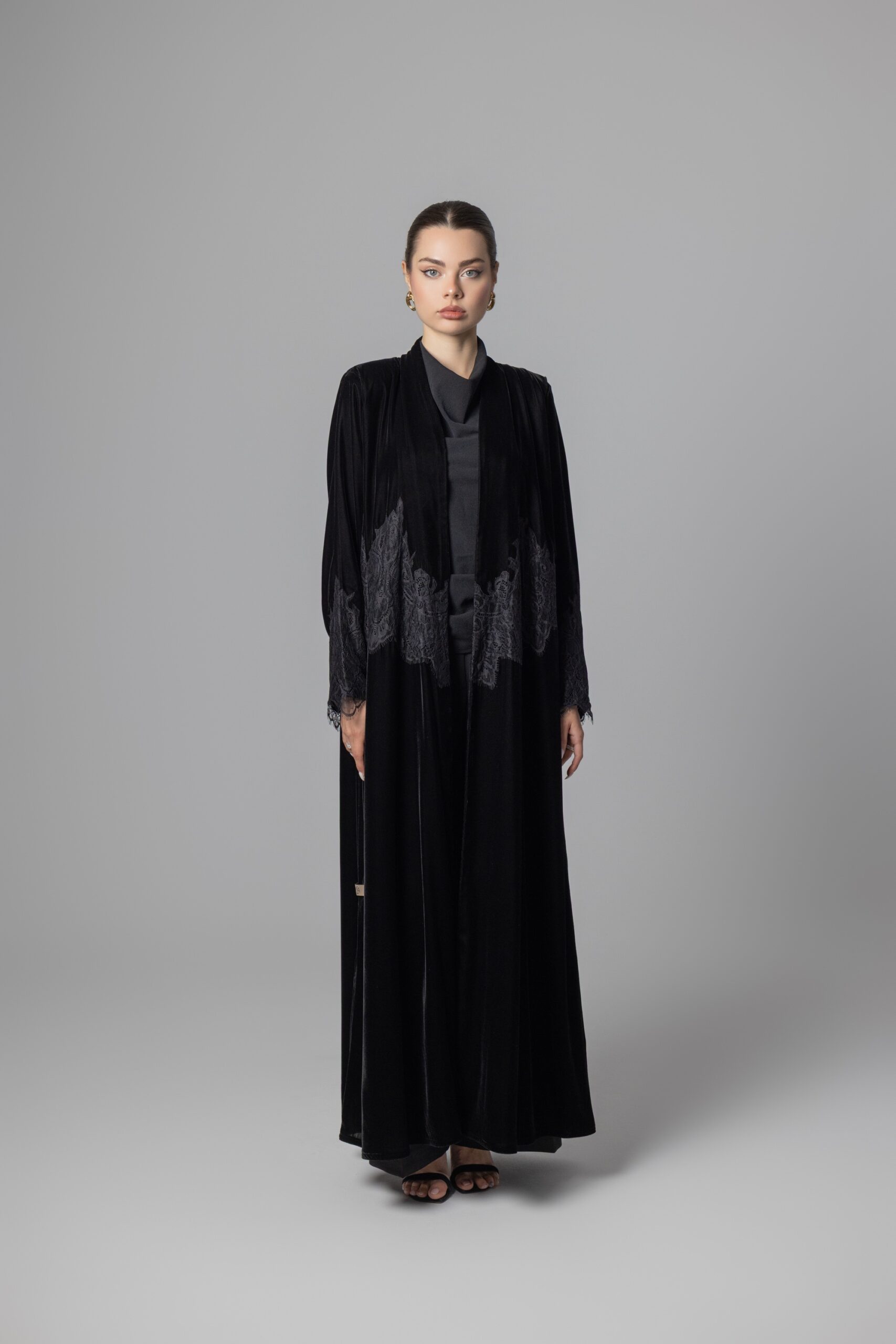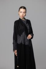 • Design: Front-open abaya with flared cut