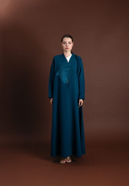 • التصميم: عباية مفتوحة من الأمام، بقصّة كلوش