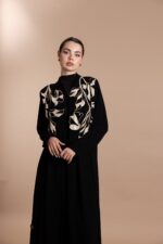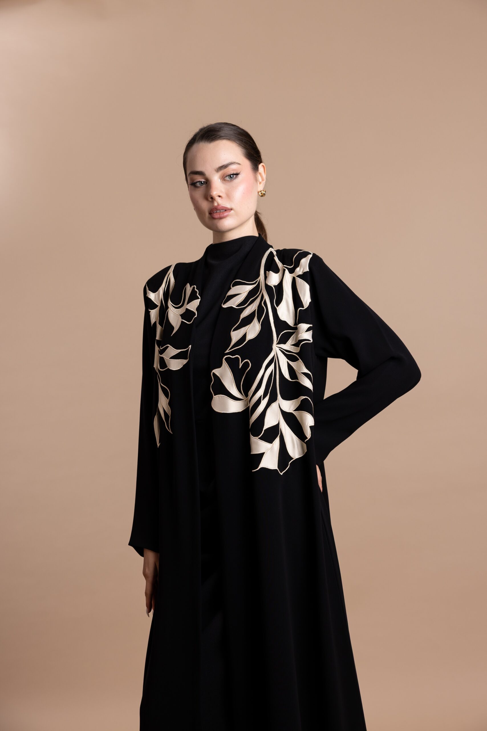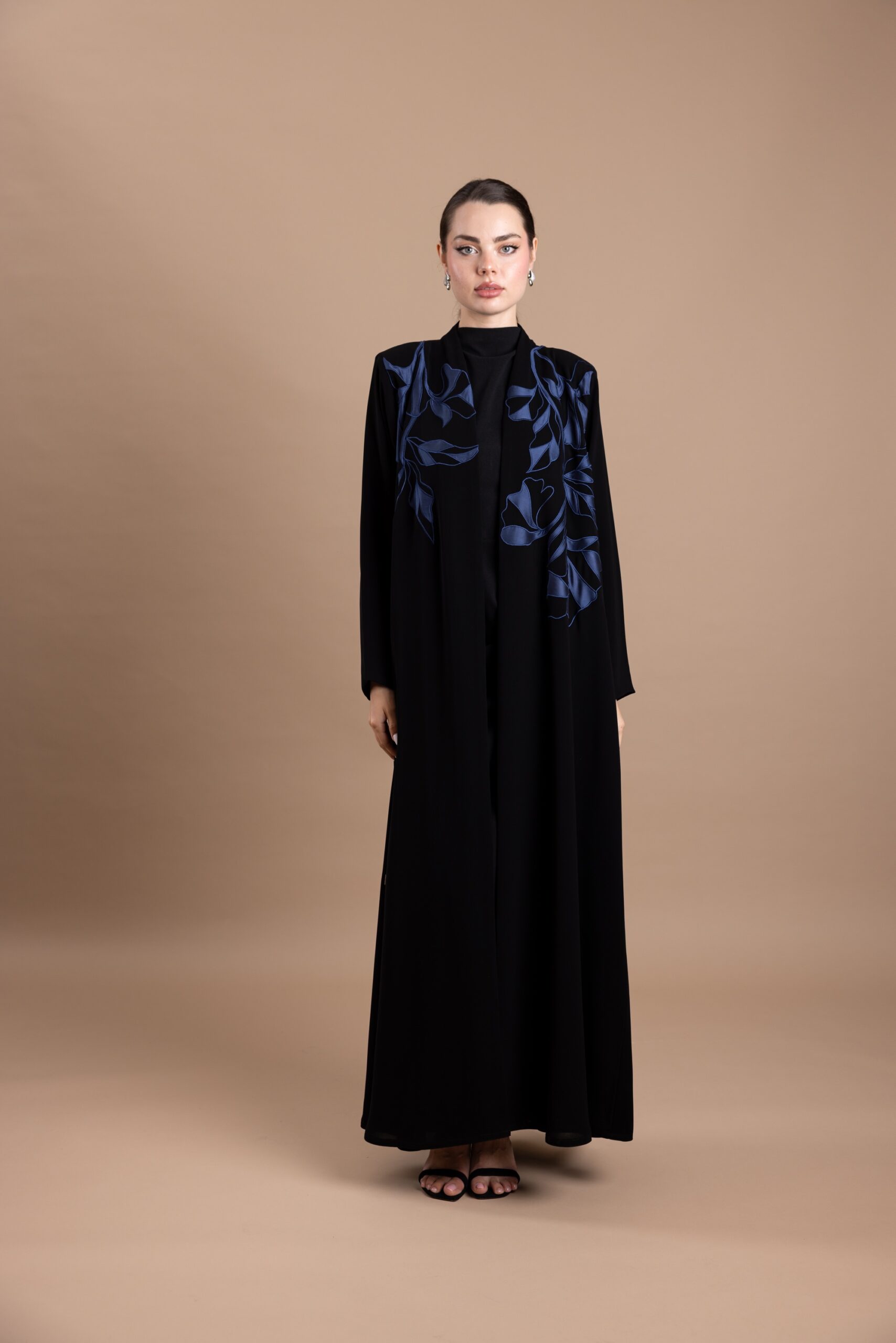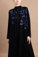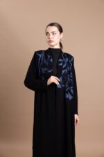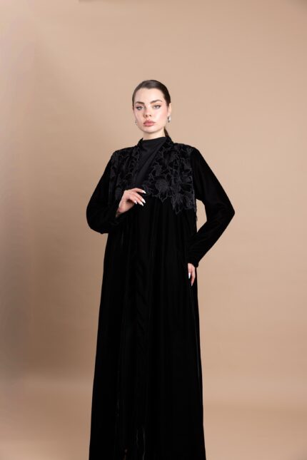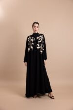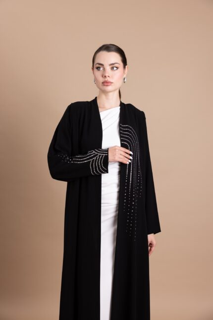 • Design: Front-open abaya with flared cut