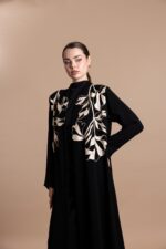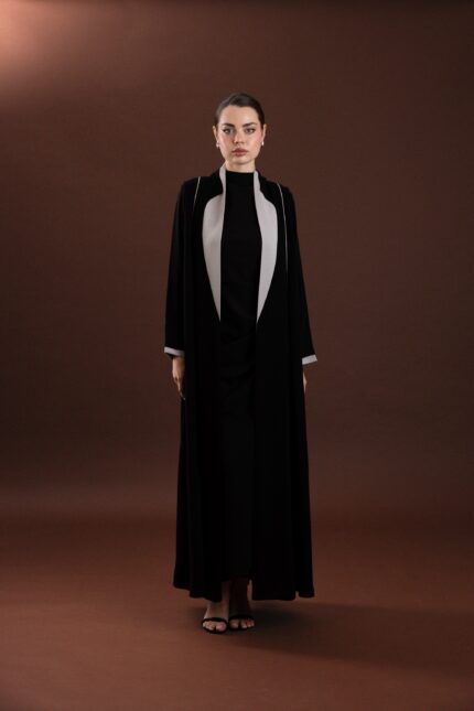 • التصميم: عباية مفتوحة من الأمام، بقصّة كلوش