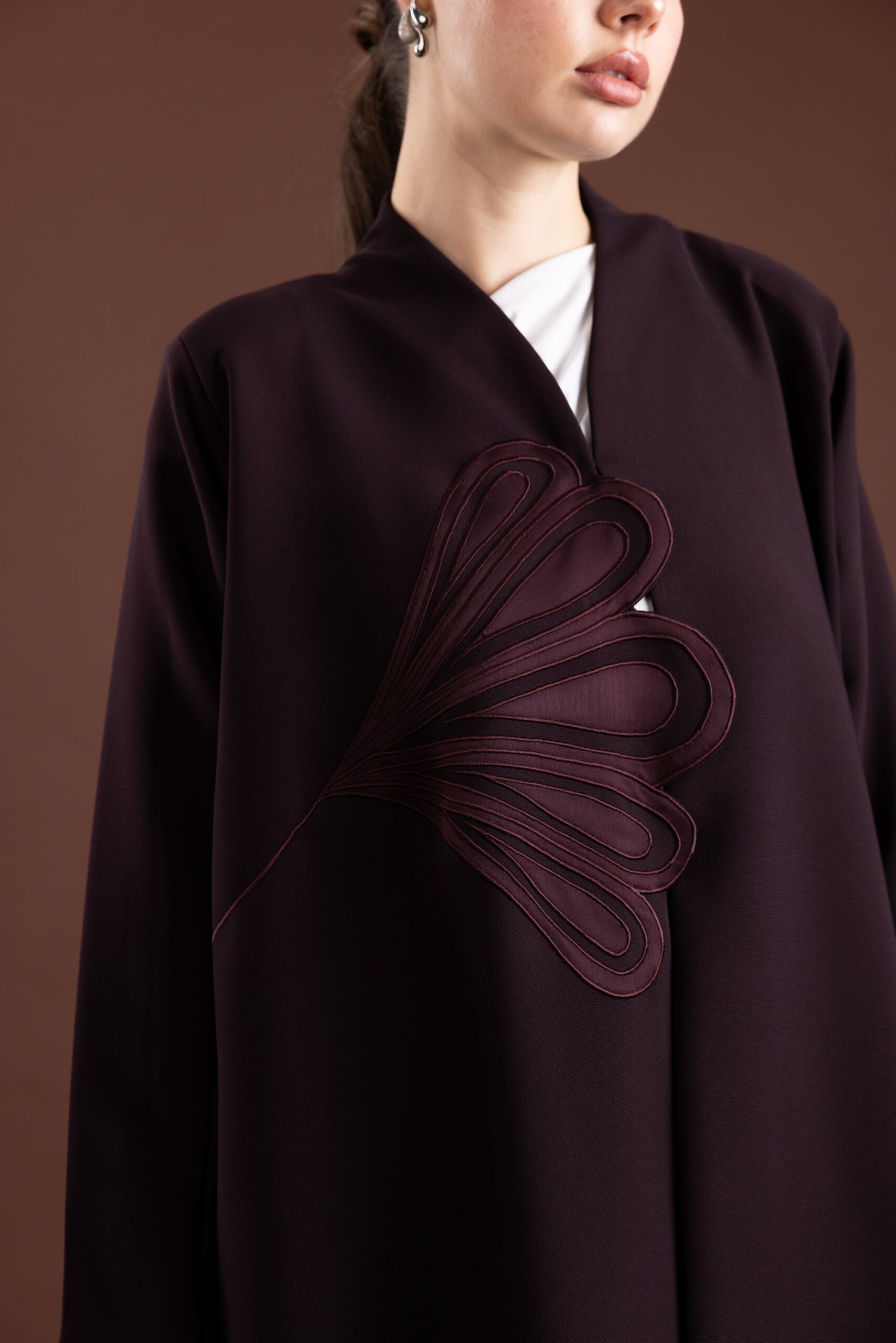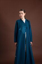 • التصميم: عباية مفتوحة من الأمام، بقصّة كلوش