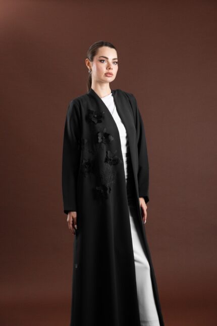 • التصميم: عباية مفتوحة من الأمام، بقصّة كلوش