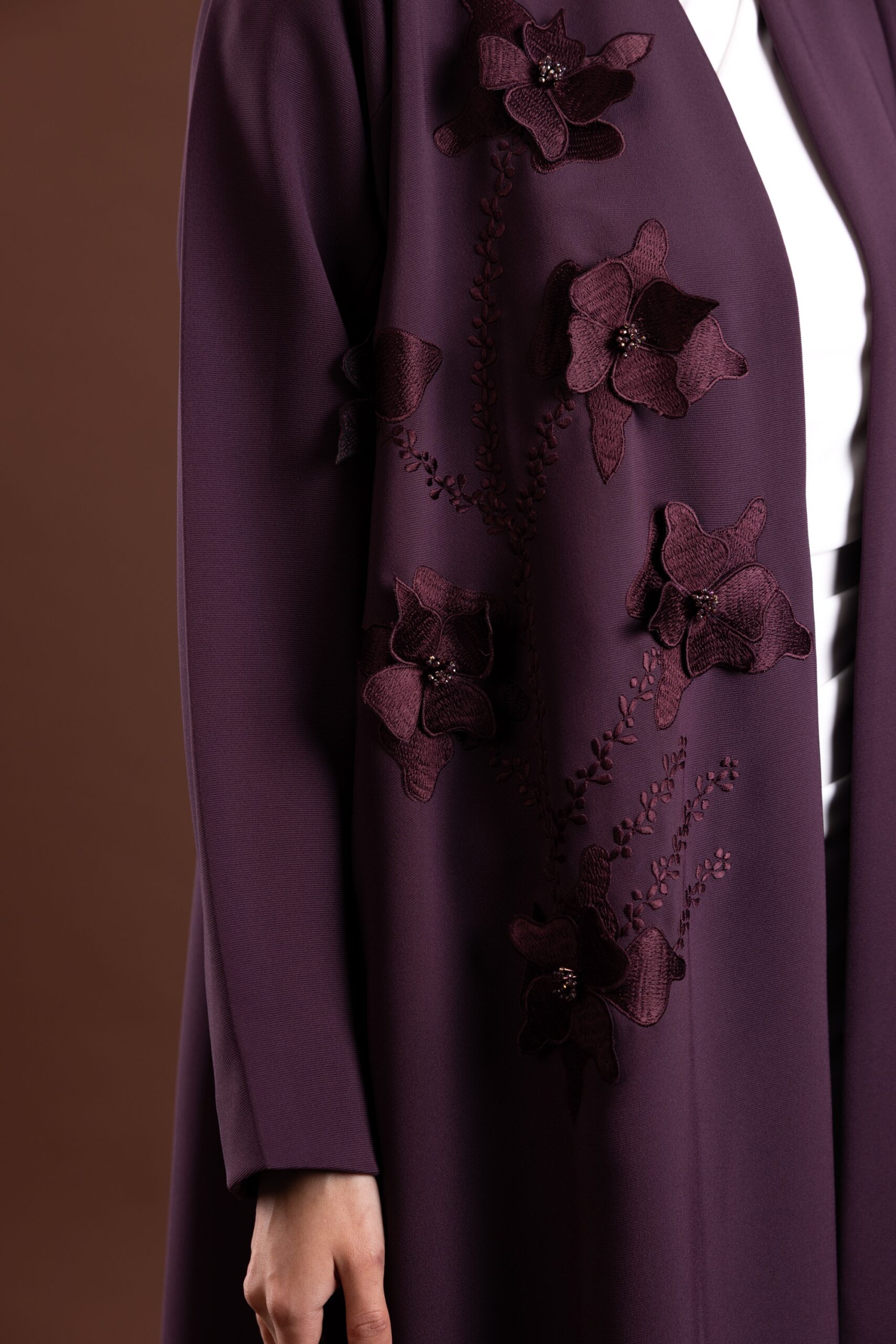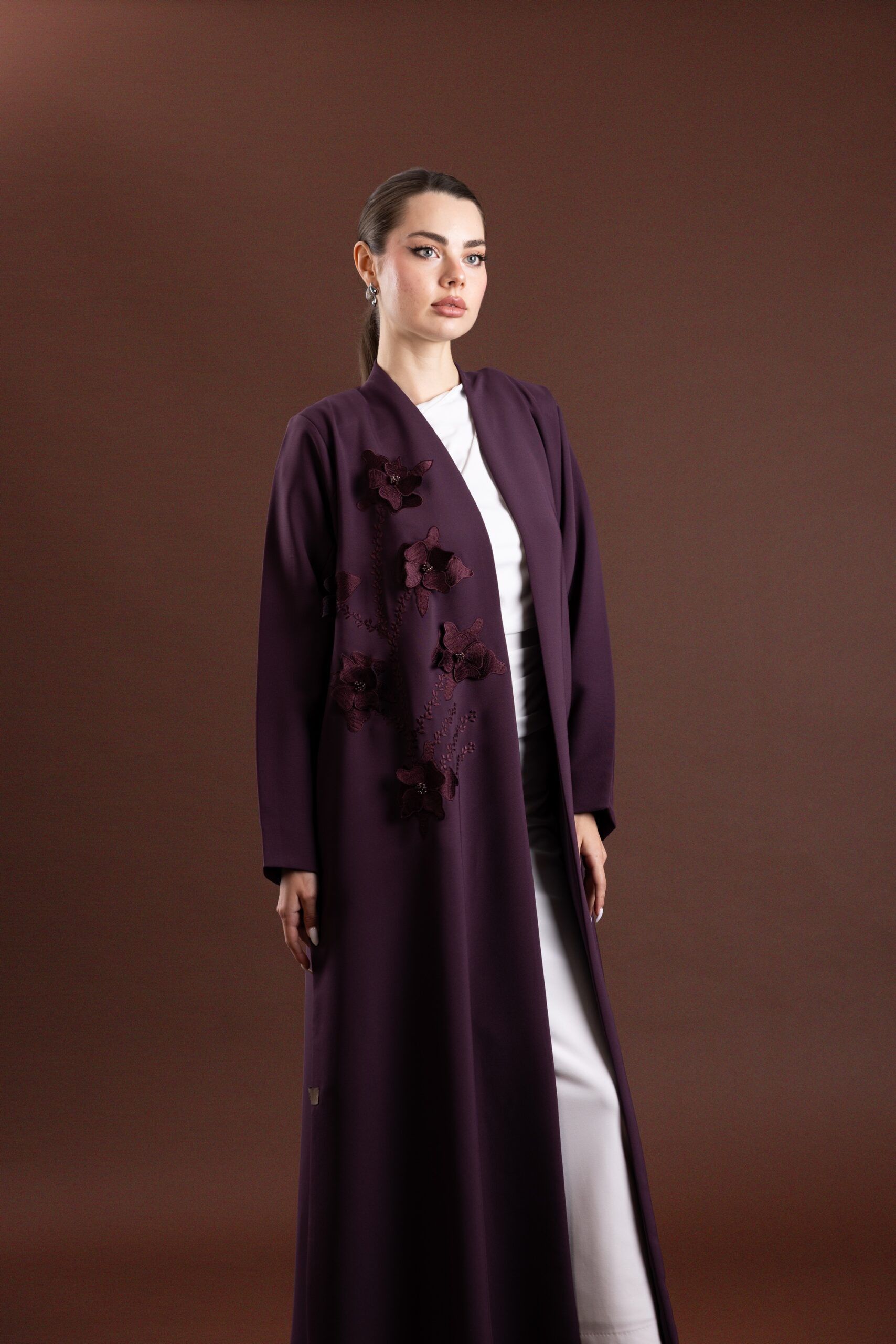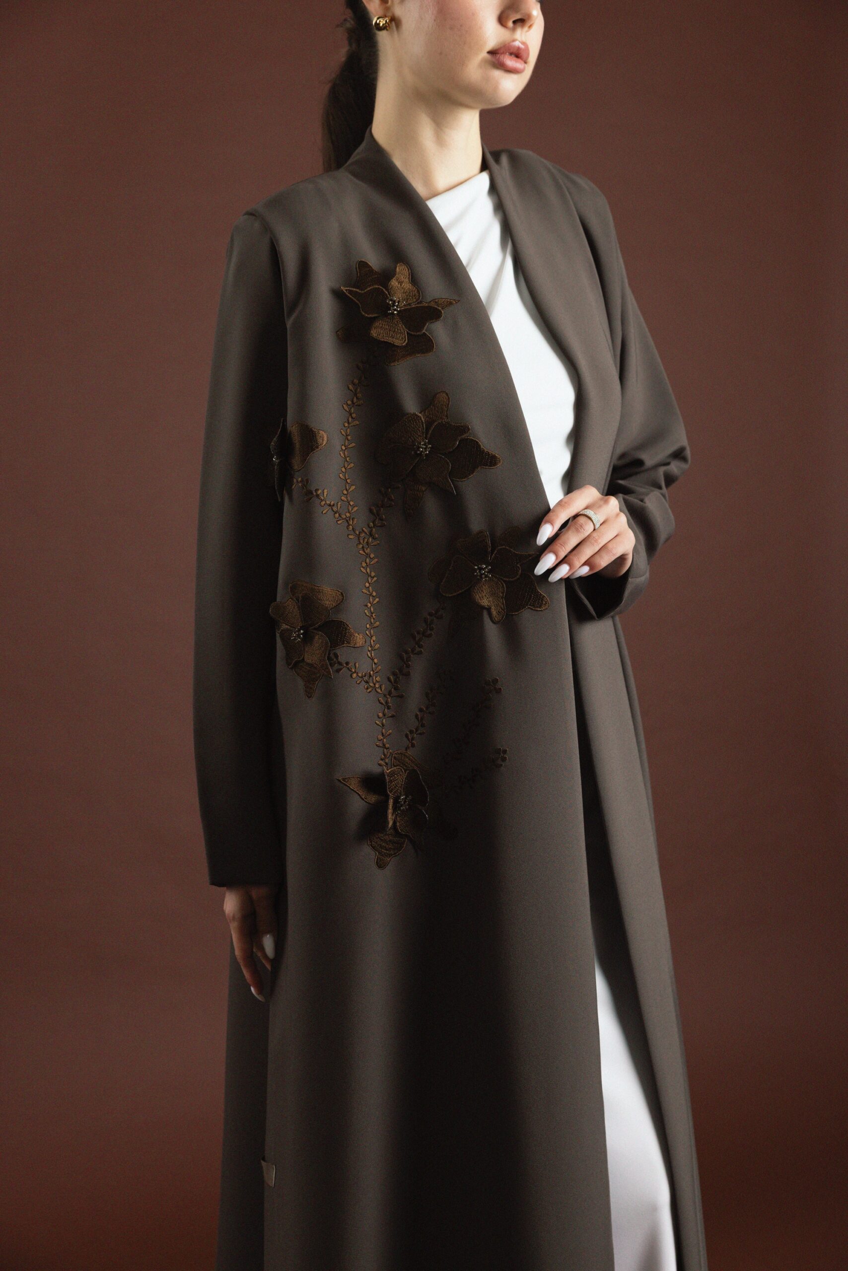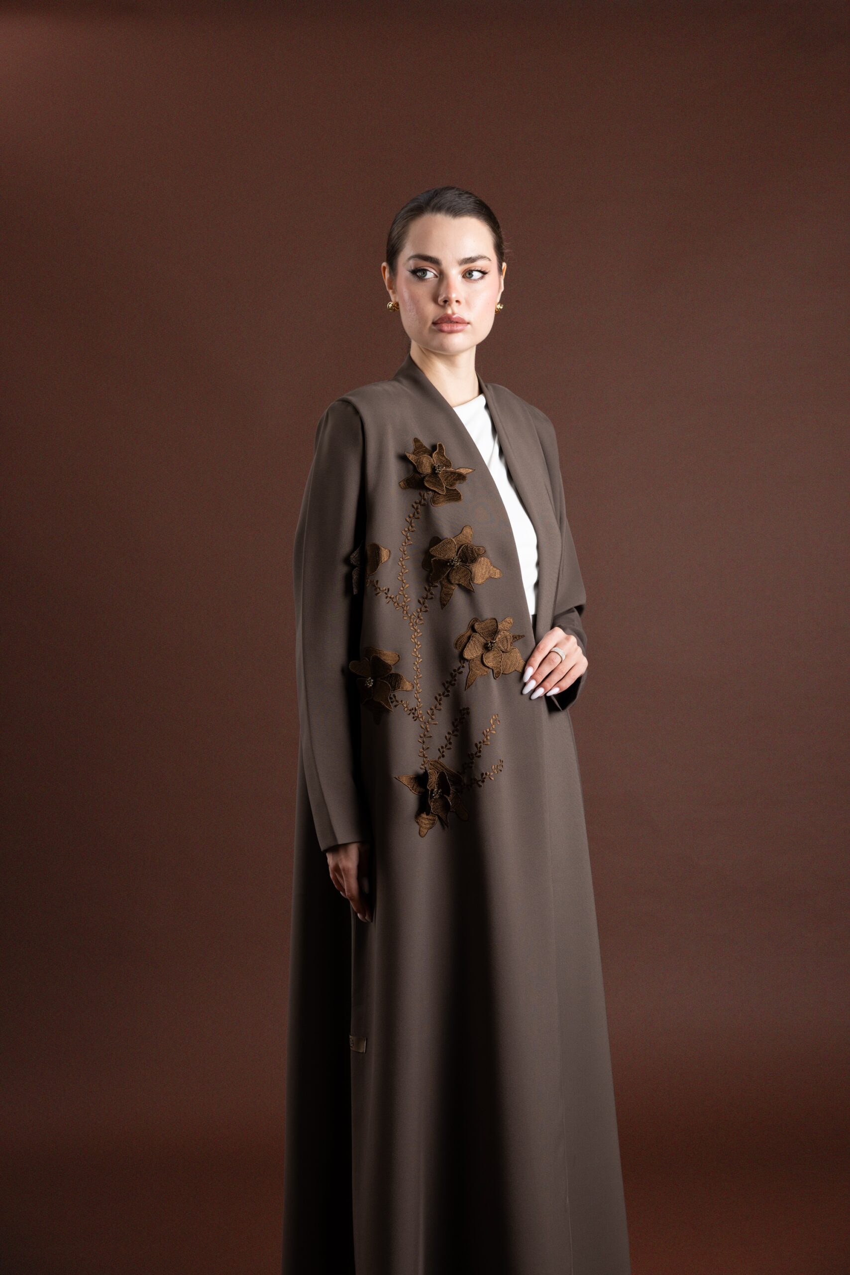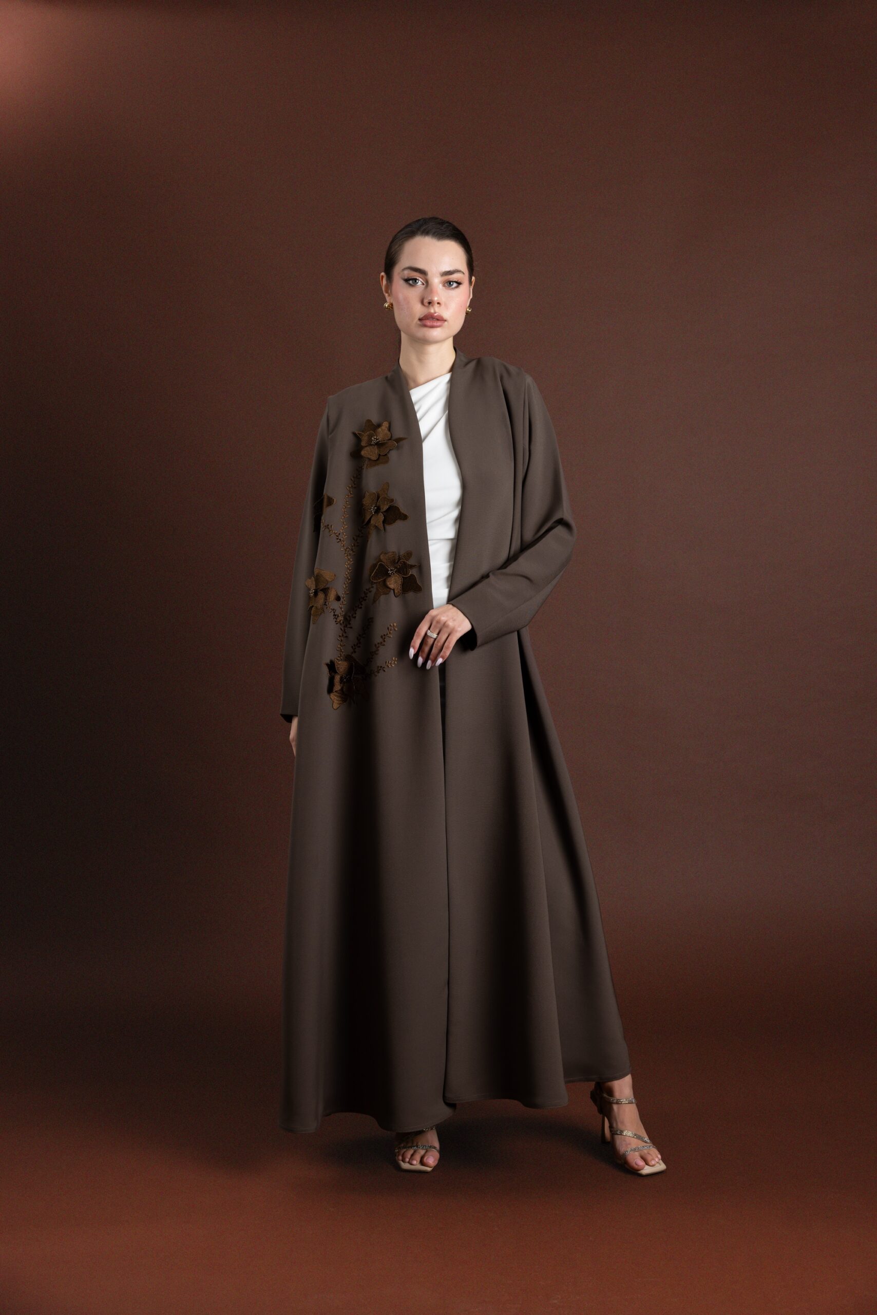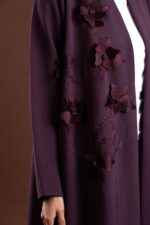 • Design: Front-open abaya with flared cut